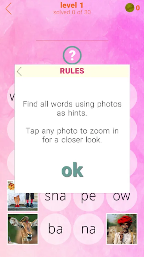 One word per photo. 30 words per level. 630 words in the game. Can you find all of them? Sometimes you have to think beyond the obvious. Good luck!