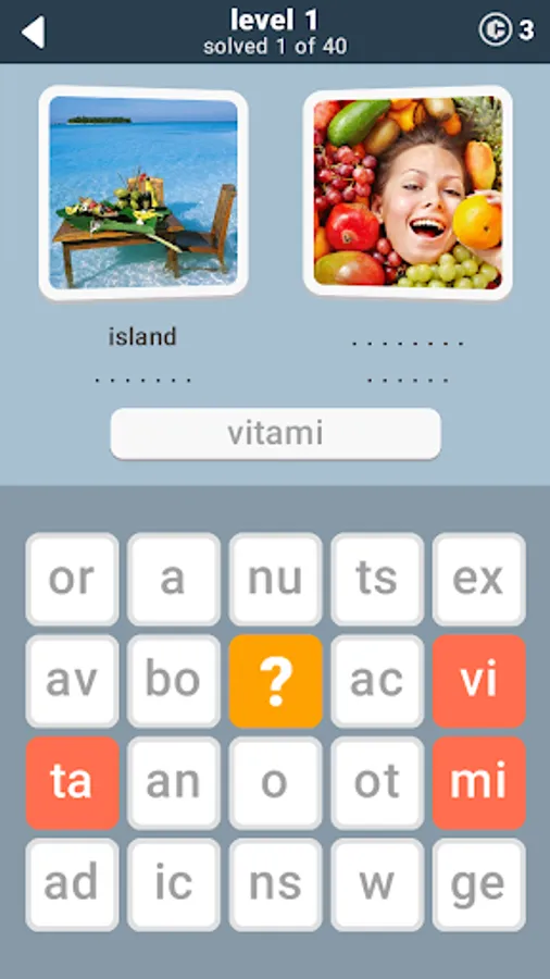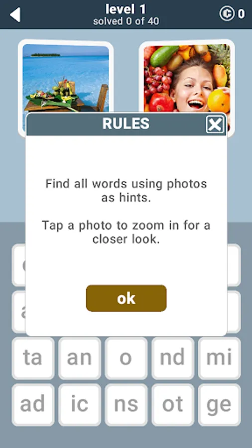 Two words per photo. 40 words per level. 680 words in the game. Can you find all of them? Sometimes you have to think beyond the obvious. Good luck!