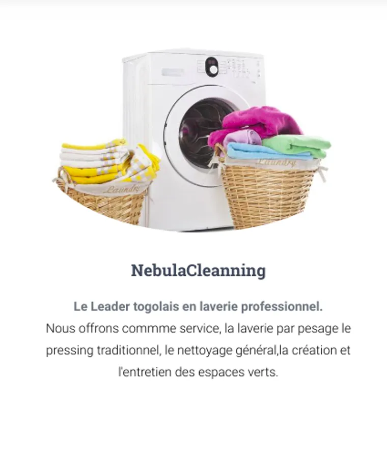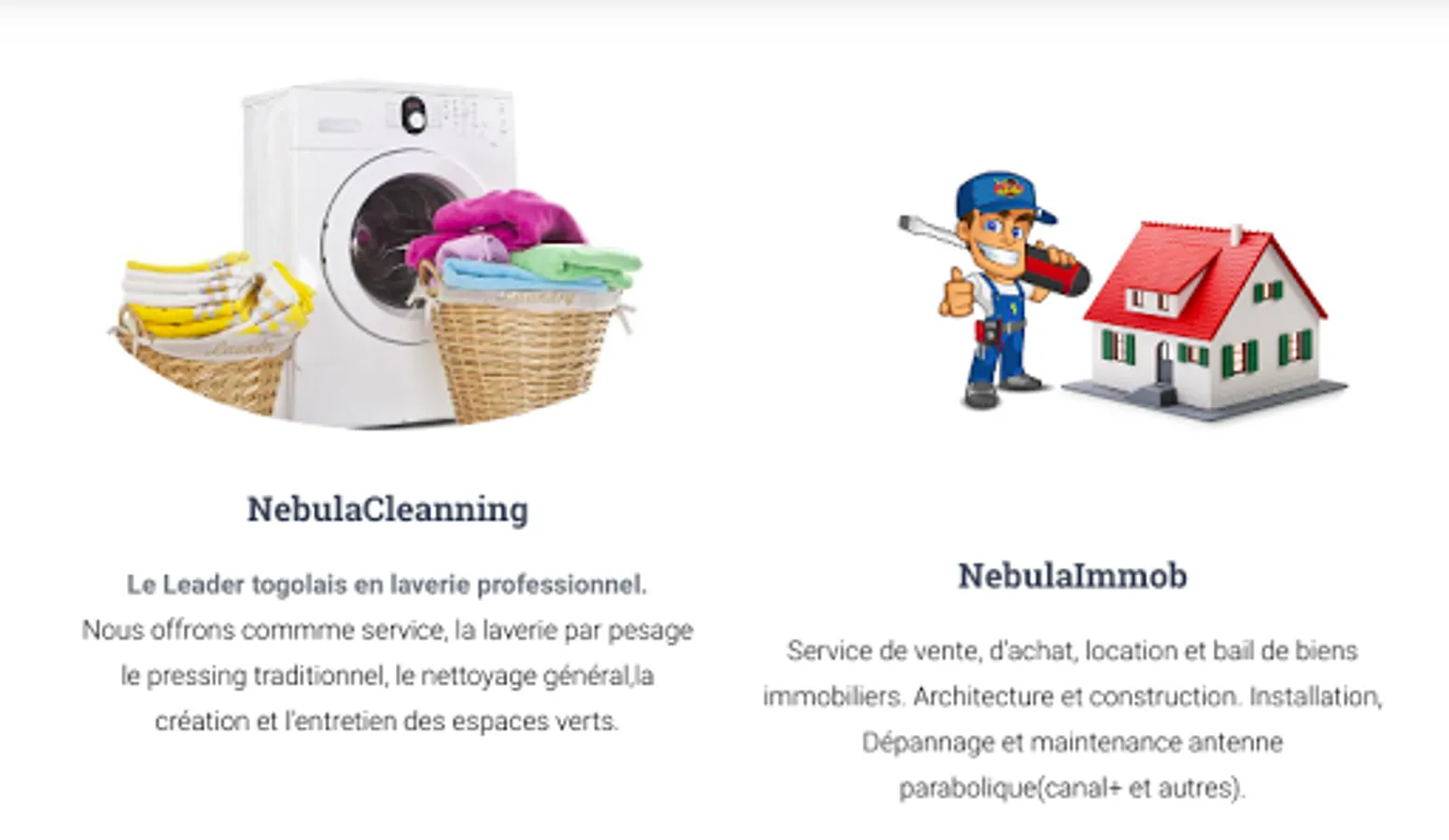 (Laundry by weighing, traditional pressing, general cleaning, creation and maintenance of green spaces) and NebulaImmob (Sales, purchase, rental and lease of real estate services) Architecture and construction Installation, Troubleshooting and maintenance Satellite dish (Canal + and others) Available 24 hours a day to satisfy you.