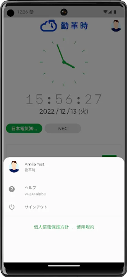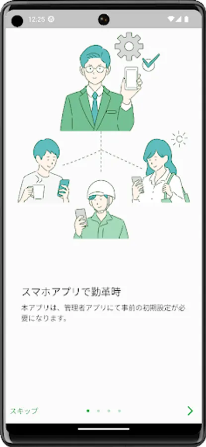 The employee app allows you to clock in and out of work. Information on the stamped time and place will be sent to the "Kinkojiki" side.