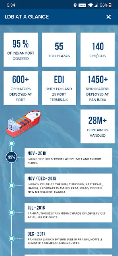 Logistics Data Bank (LDB) provides container visibility service across all key Indian container terminals during its journey through Road, Rail and Sea. Our services help stakeholders track Containers, compare performance metrics and bring in much required visibility and transparency across supply chain. The new features also provide high sea visibility of the containers starting from Port of Origin to Port of delivery with transhipment and transit points. LDB system is integrated with Terminal Operating Systems (TOS), Freight Operation Information System (FOIS) and other third party EXIM data sources.