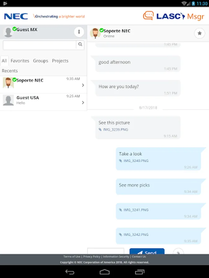 The LASC Messenger App is a secure and encrypted communication tool for NECAM LASC Team and the Network of NEC Companies and Partners in Latin America. Functions include Post Message integration with Connecsys, group conversations, as well as personal 1 on 1 communication.