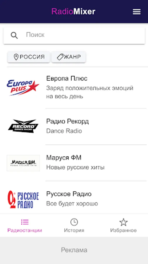 Free online Radio in the RadioMixer app gives you the opportunity to choose your favorite and popular radio stations. It is very convenient to listen to the radio online thanks to its clear and simple interface. It is enough to press one button - and the radio online for free and will tirelessly entertain you as much as you want.