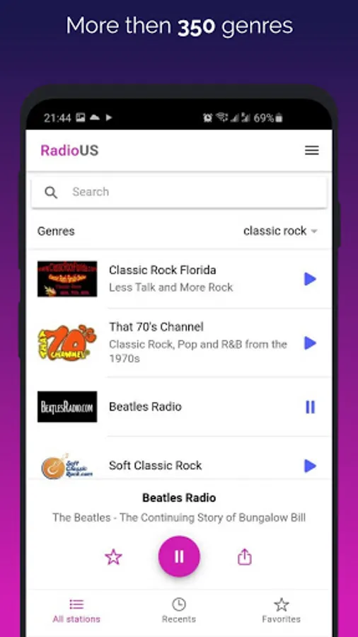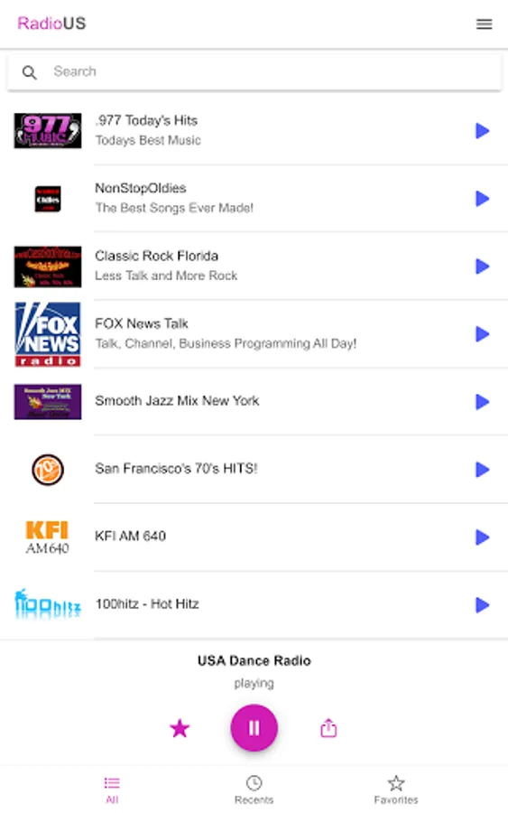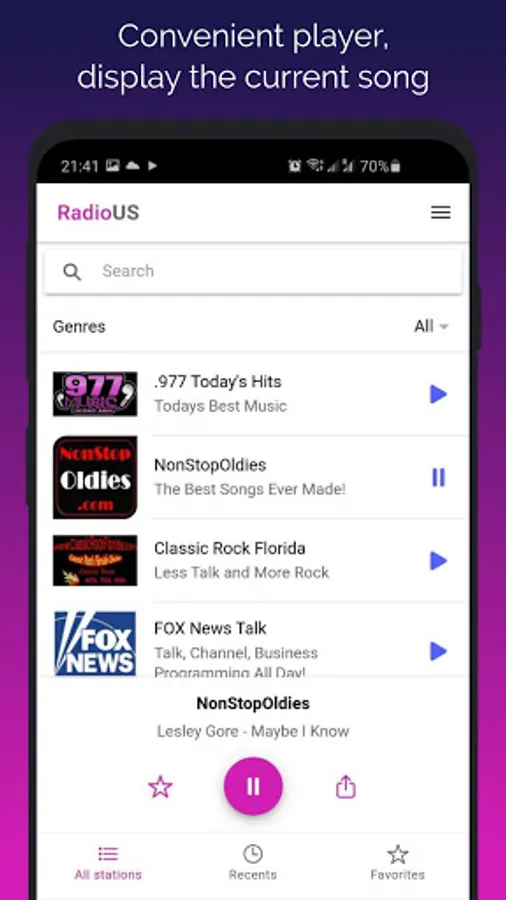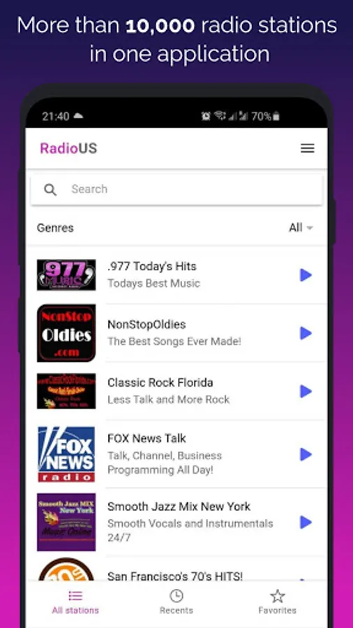 Our app allows you to listen live to all FM radio stations and Internet radio from the USA.