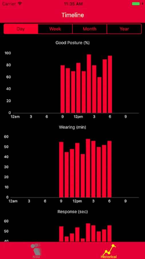 2. 報告姿勢訓練記錄,包括(1)正確姿勢比例、(2)配戴時間、(3)反應時間等,並依當天、當週、當月、當年等四個時間軸統計。