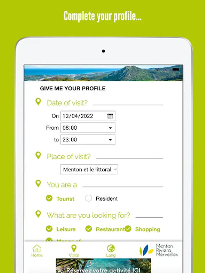 Fill in your profile, submit your centres of interest and discover all leisure activities available (restaurants, boutiques and shops, excursions, workshops) that suit you.