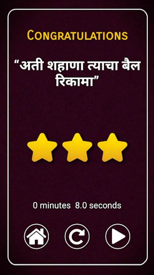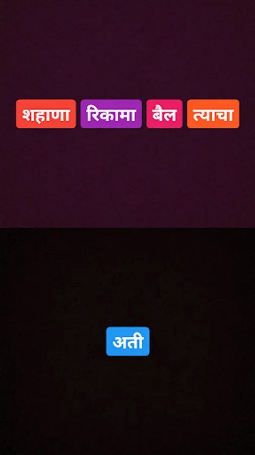 Marathi Sentence Maker consists of 510 levels. Sentences are made up of Marathi Suvichar, Mhani, Vichar. मराठी शब्द जोड | Sentence Maker या गेम मध्ये ५१० लेव्हल्स असून, यात मराठी सुविचार, मराठी म्हणी, मराठी वाक्प्रचार आणि मराठी प्रेरणादायी वाक्यांचा उपयोग केला आहे. यात शब्द जोडून तुम्हाला एक अर्थपूर्ण वाक्य बनवायचे आहे.