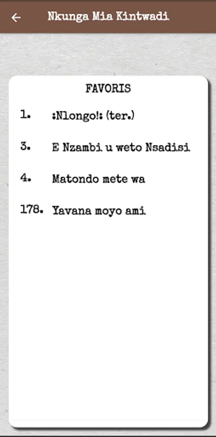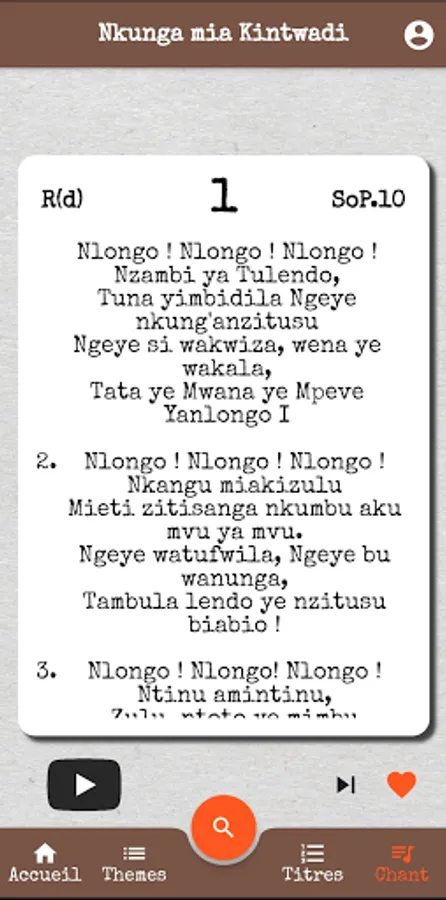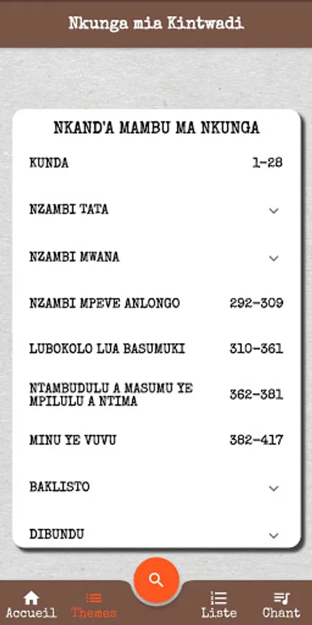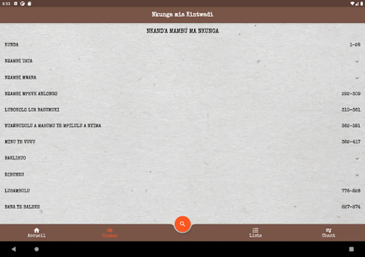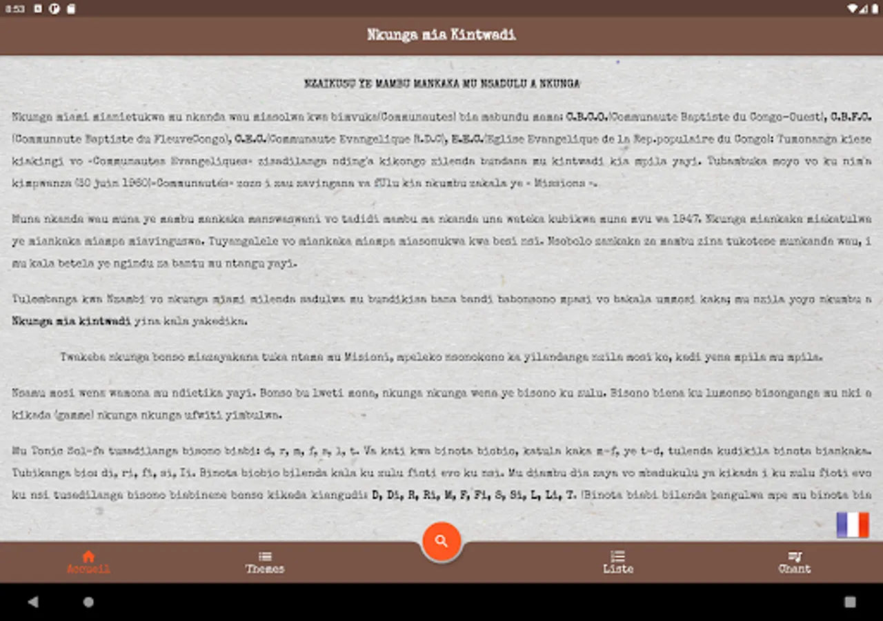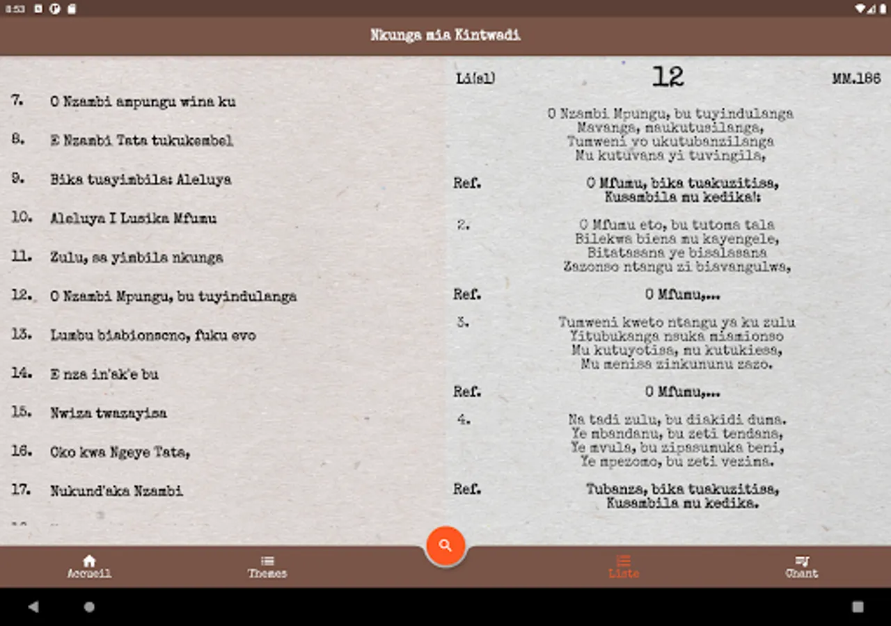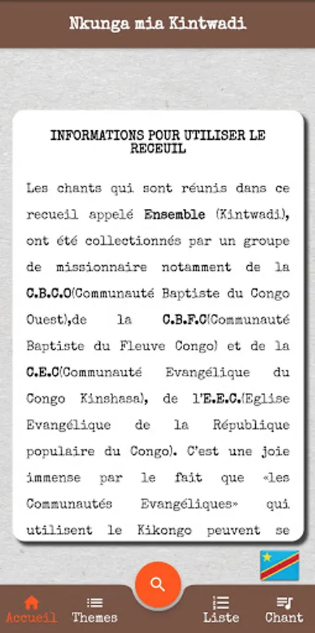 Collection of Kintwadi hymns, hymns sung by the evangelical communities of Congo (CEC, CBCO, CBFC, EEC). Mainly in the Kikongo language, spoken in the two Congo, in Angola and Gabon. This application allows you to view song lyrics, navigate between songs and search for titles.