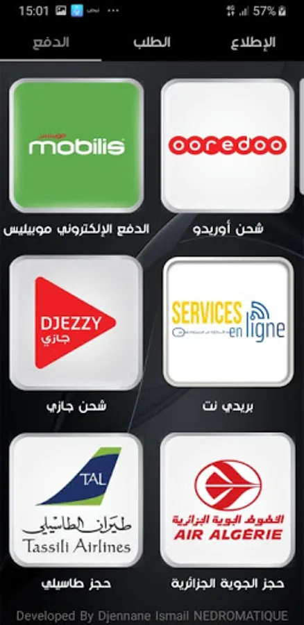 القسم الأول: الدفع ، يحتوي على جميع الخدمات التي لها علاقة بالدفع الإلكتروني