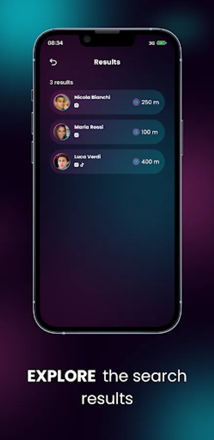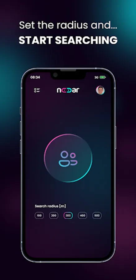 The app allows you to find people nearby (radius from 0 to 500 m) through geolocation by connecting your social accounts.
