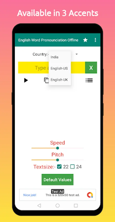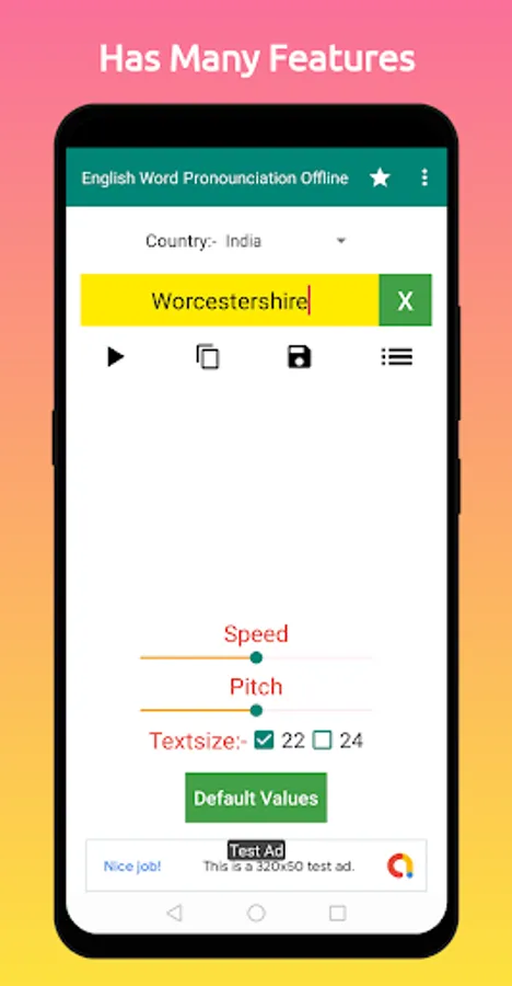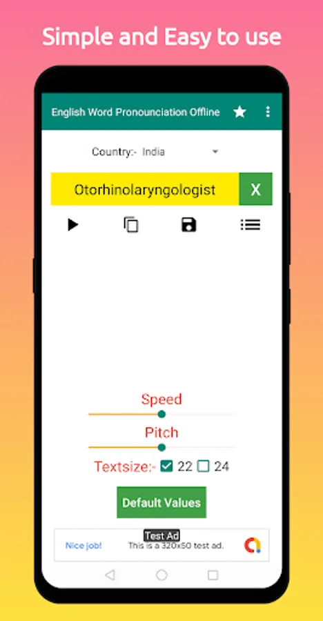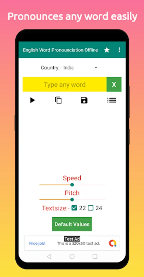 English Word Pronounciation Offline is a app in which you can type a difficult pronouncing word such as Otorhinolaryngologist, Anemone, Isthmus etc. and when you click the speak button your phone will speak those hard words. You can adjust the speech rate and pitch of the voice so that you can easily learn how to pronounce those difficult words.