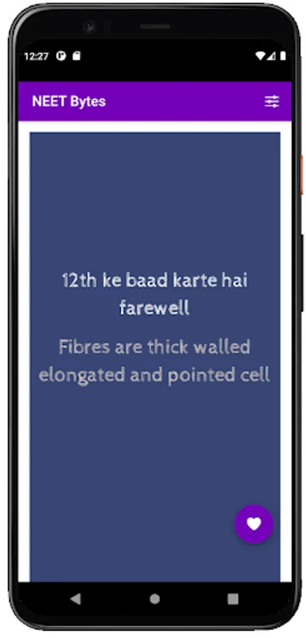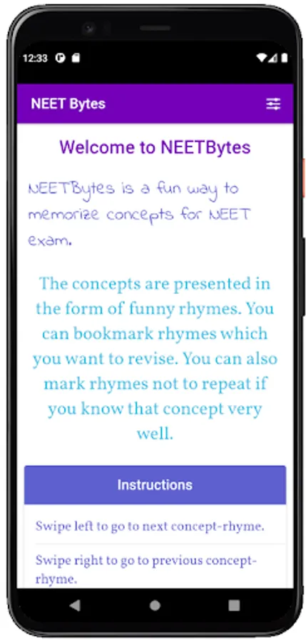 This app helps you score high in NEET exam with an unique tool called 'concept rhymes". NEET concepts are presented in the form of funny rhymes. This method helps you to remember important points and answers easily and for ever.