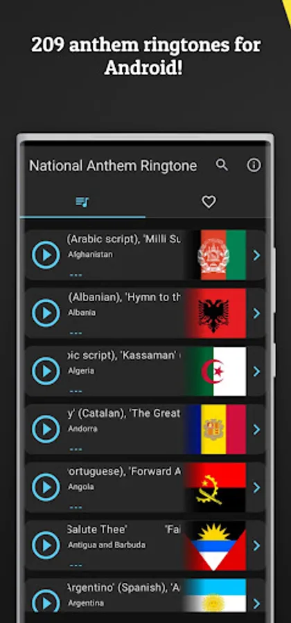 Customize your phone with the best free ringtones for Android on the market today. In this app you can listen to the national anthem and download national anthem as ringtones for free. All national songs are listed with country flags and country name, to make it easy for the user to find and download ringtone.