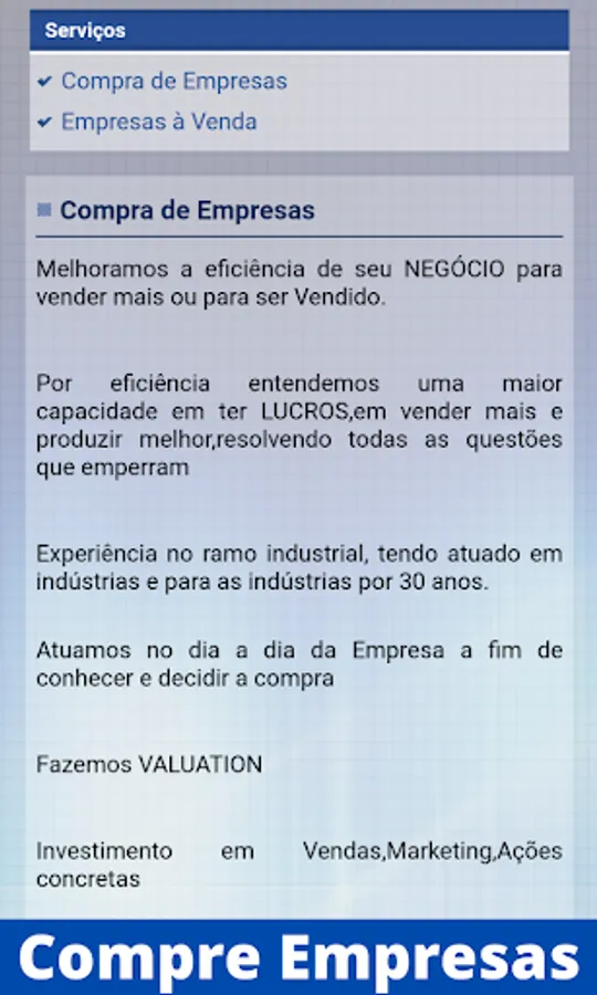 NegociosCompraVenda-NCV We do the job of increasing the sales of your products and or selling your Negocio.Atuamnos with all the activities of your Business with the purpose of understanding to be able to improve the sales and consequently the profits.Our costs for this consultants are low.
