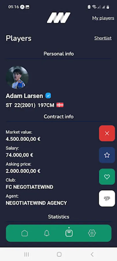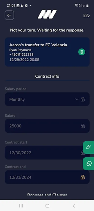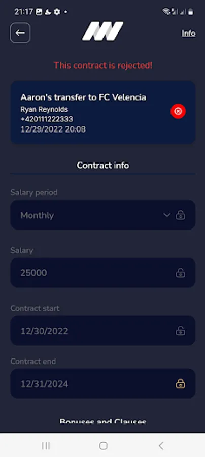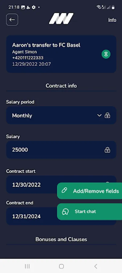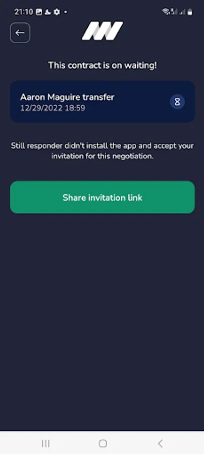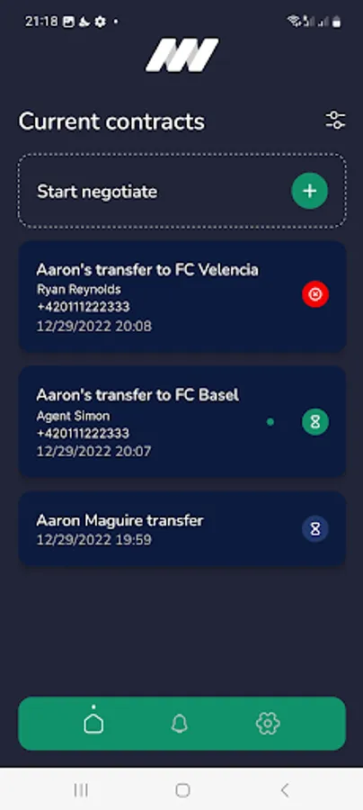 NegotiateWind helps you create customized football contracts. It allows you to have full transparency over your agreements in one place, so no need to scroll through messages and try to understand what and with whom you agreed. You don't need to speak the same language as your contact, just select the language you want to negotiate with and your client will be able you choose the language he/she is comfortable with. All you need to do is add a person you want to negotiate terms with, fill in preconfigured fields and send for an agreement. It is also possible to add contacts (spectators) who should be aware of the agreement. Once the counterparty accepts, rejects or suggests changes to your proposal, you will get notifications. After both parties accept the offer, the contract will be finished successfully and the final PDF document with the agreement will be generated. Contact us to find out more.