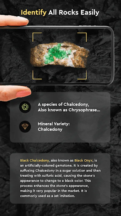 Rock Identifier by Photo, Stone Identifier ID, Dimond Tester App is a comprehensive application that allows geologists and hobbyists to examine and explore minerals, rocks, gemstones, and crystals features. Rock-Identifier by Photo, Stone ID, Gem Scanner App helps you to identify many types of fossils that you will find.