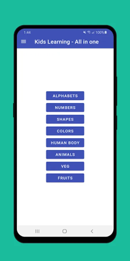 Kids Learning - all in one provides various learning options for Pre school and Kindergarten kids, recognize alphabets, recognize numbers, recognize various animals names, recognize various fruits names, recognize various vegetables names, recognize human body parts.