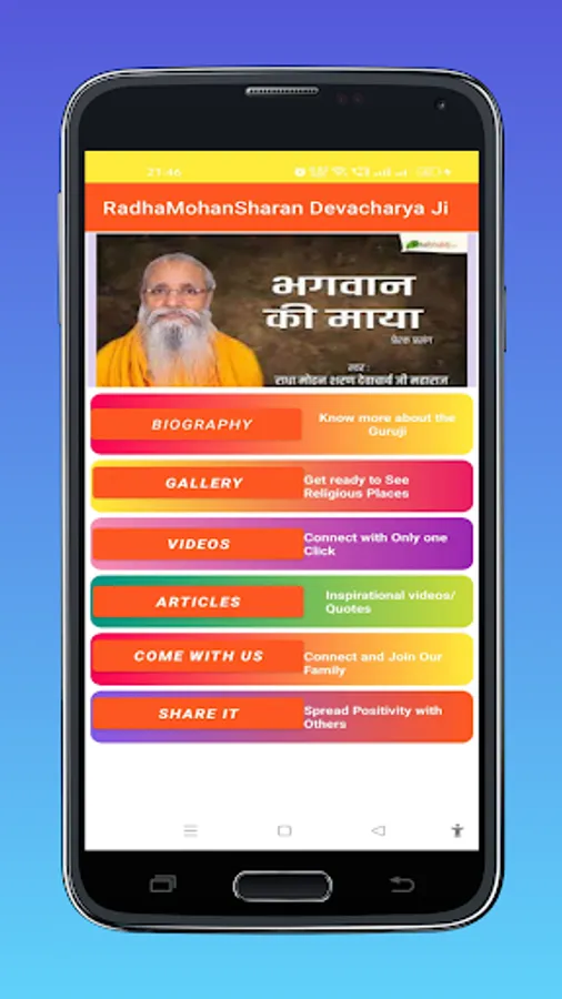 This app is dedicated to Shri Radha Mohan Sharan Devacharya Ji Maharaj to spread spiritual teaching and build values in one's life.