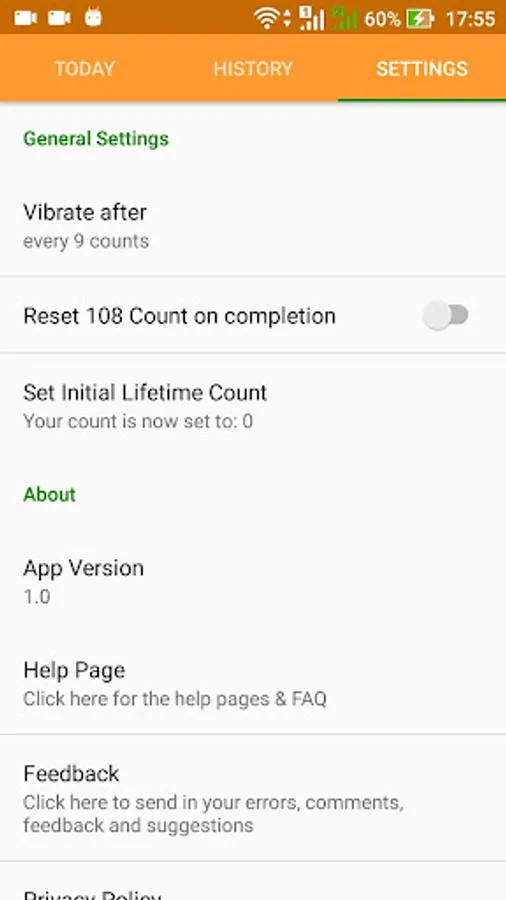 - In the settings page "Reset 108 count on Completion" will reset the centre button once we have completed a 108 count.