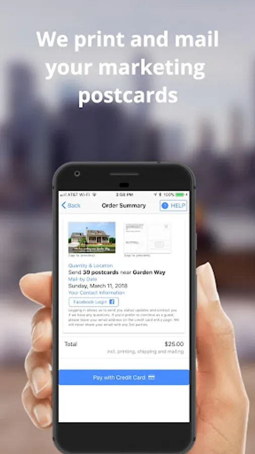 The postcards are printed and mailed to the neighborhood of your choice within 24 hours.