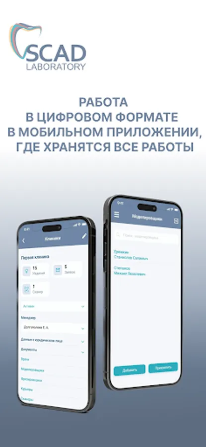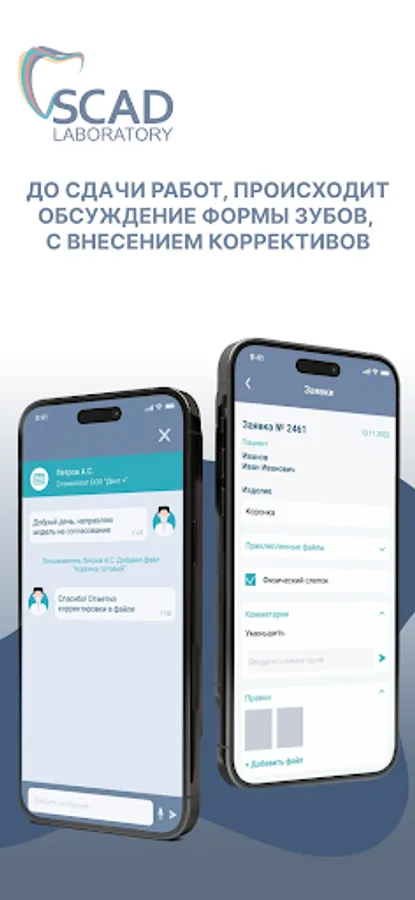 The application is part of the service infrastructure that unites doctors, dentists, clinics, dental technicians, modelers, and millers. The entire infrastructure allows you to send an application with a 3D model and a voice message, and the courier will bring you the finished product.
