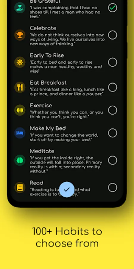 ✨ 100+ habits to choose from in areas of mental health, self-care, fitness, self-improvement, productivity, learning, mindfulness, relationships, and finance - everything you need in one app.