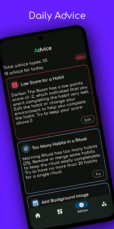 ⚡ Track your habits and tasks by organizing them into Rituals or Routines, schedule alarms and notifications to nudge you towards maintaining healthy behaviors, and receive practical advice on how to improve yourself, based on our algorithms and analytics.