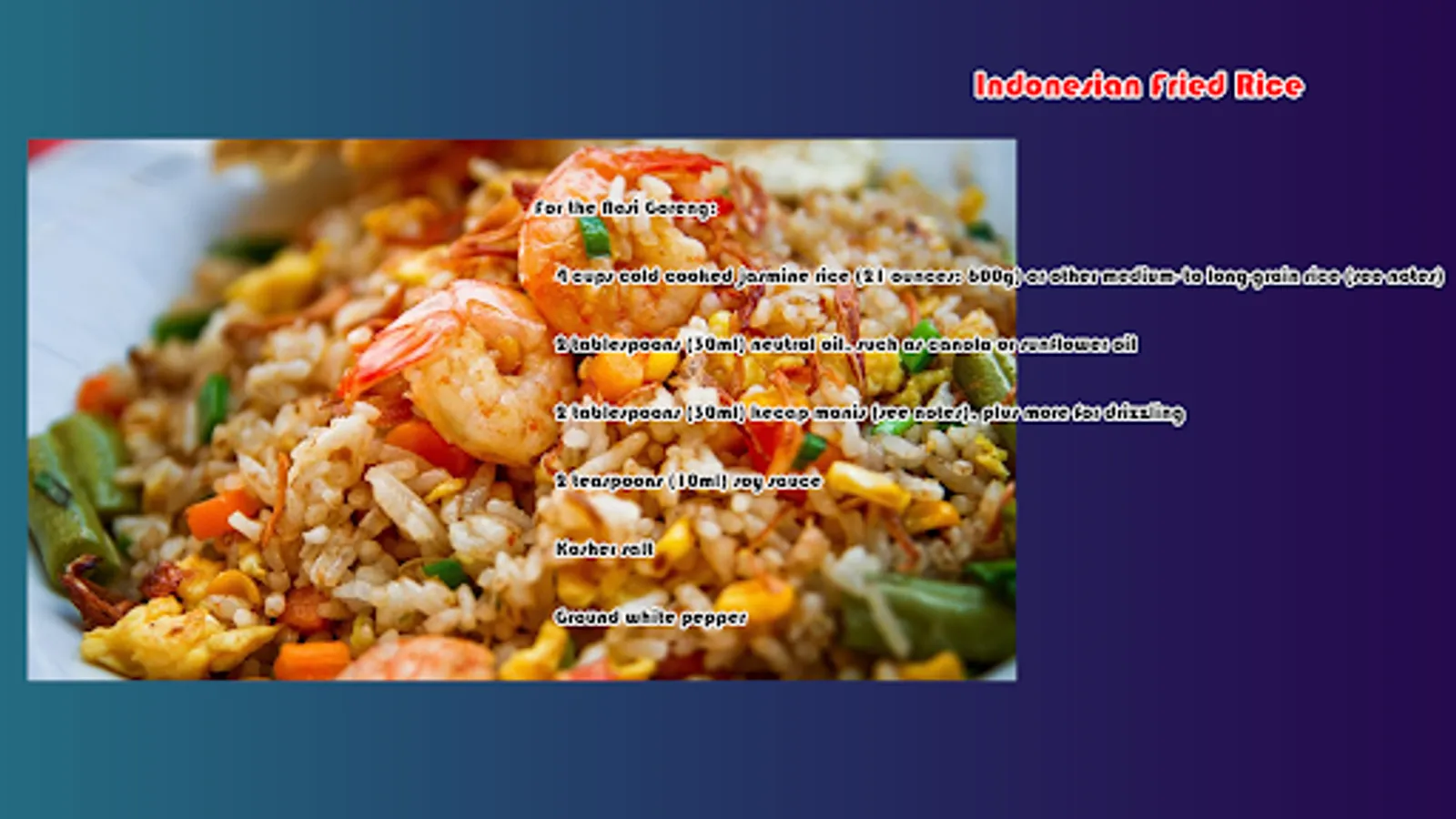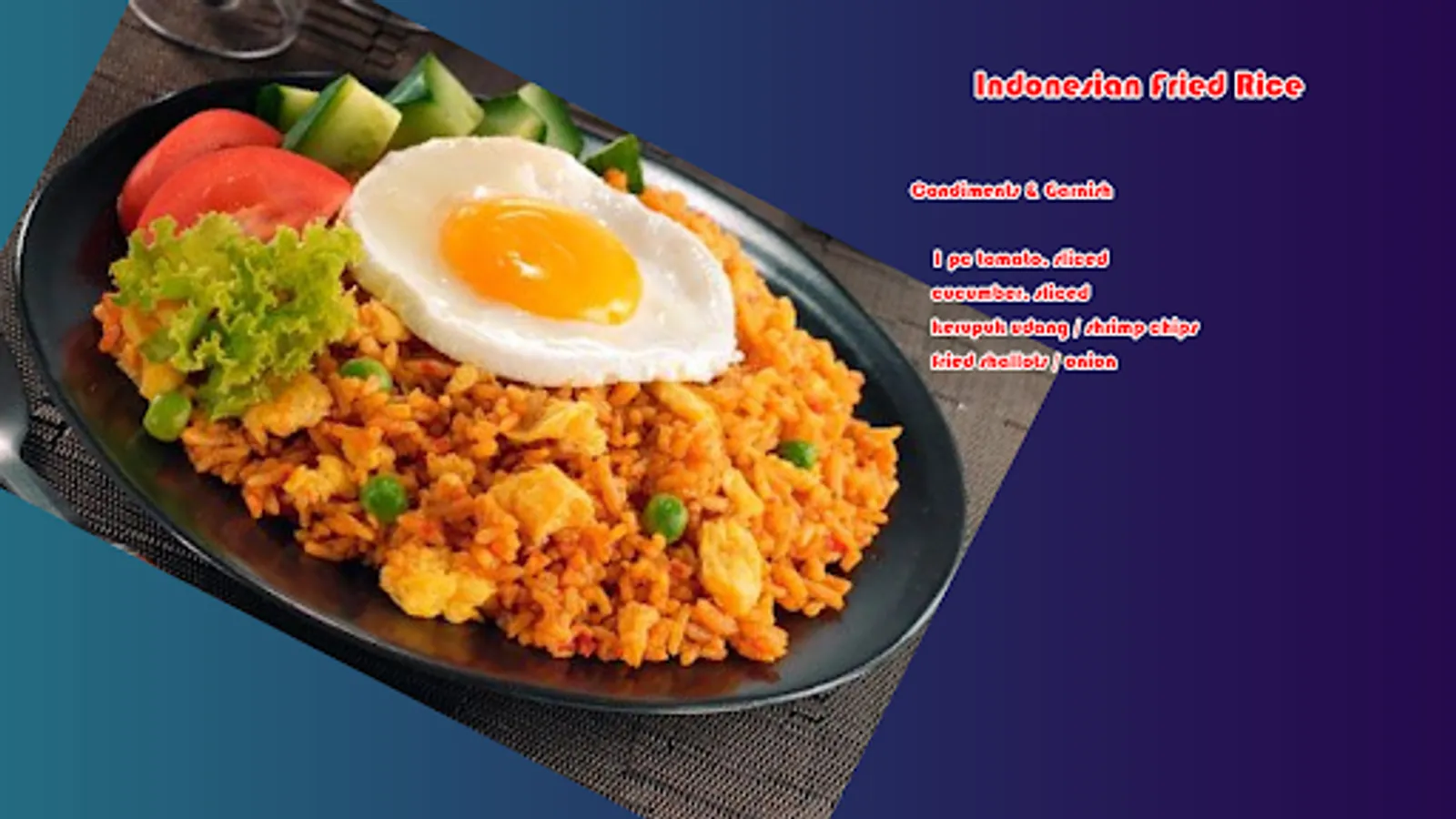 If preferred you can add shrimps or vegetables to your Nasi Goreng such as: beansprouts, peas or shredded carrots.