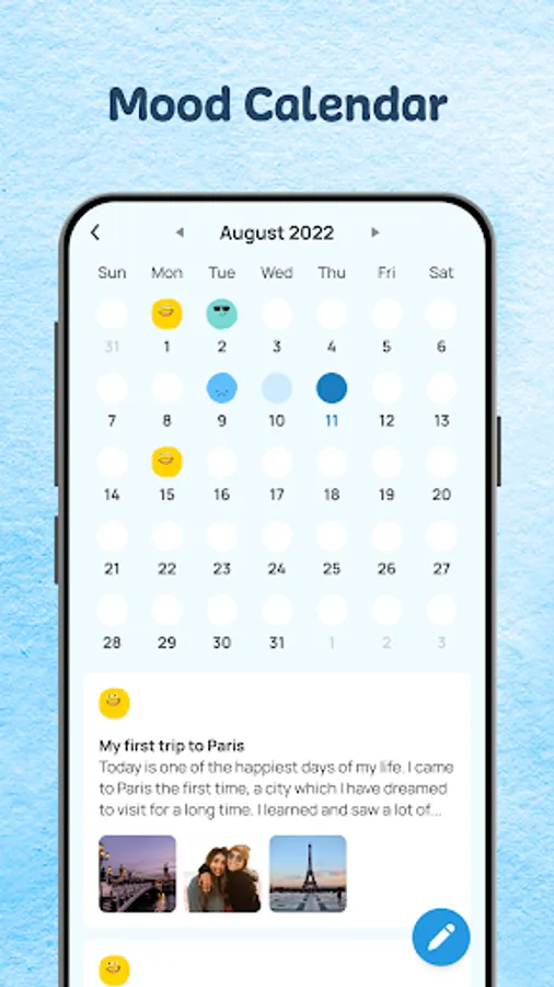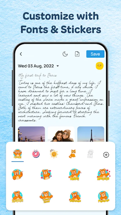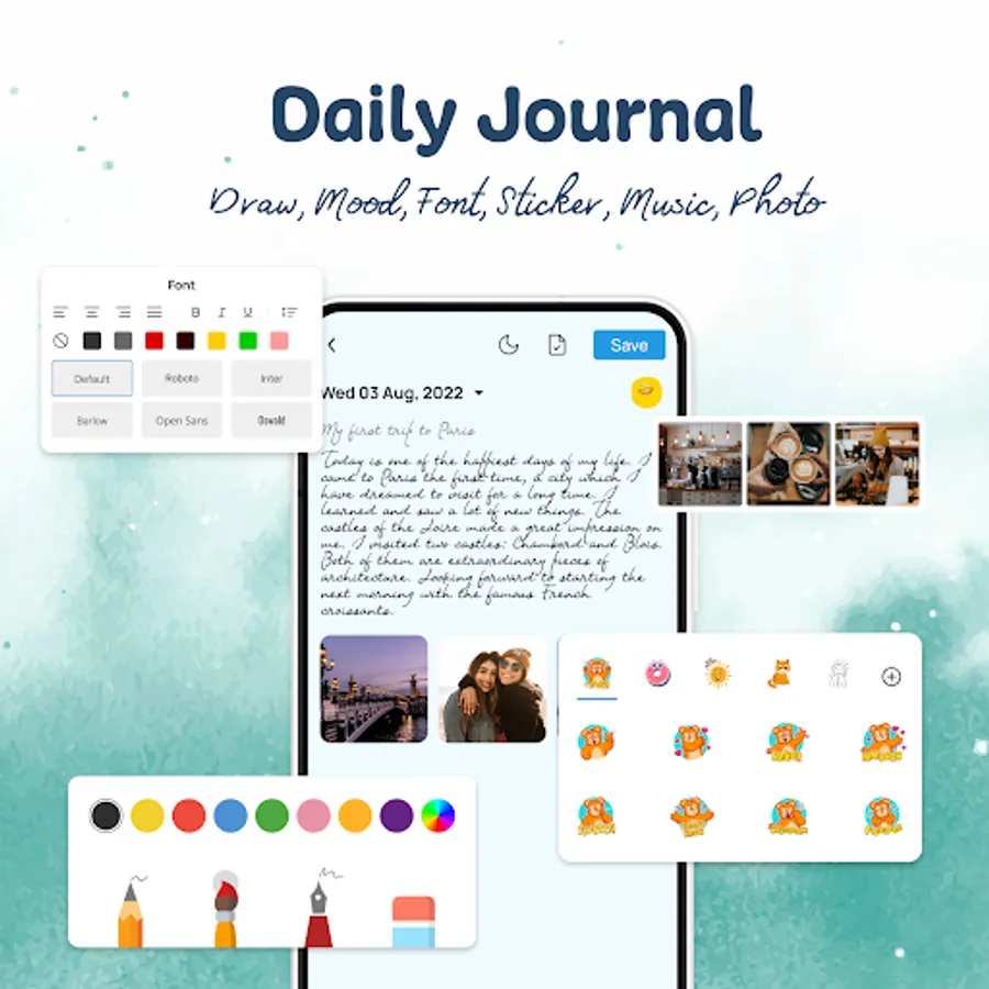 Create a daily diary with images, videos, and audio as attachments, or simply use stickers, mood or app themes, change the font, and so on.