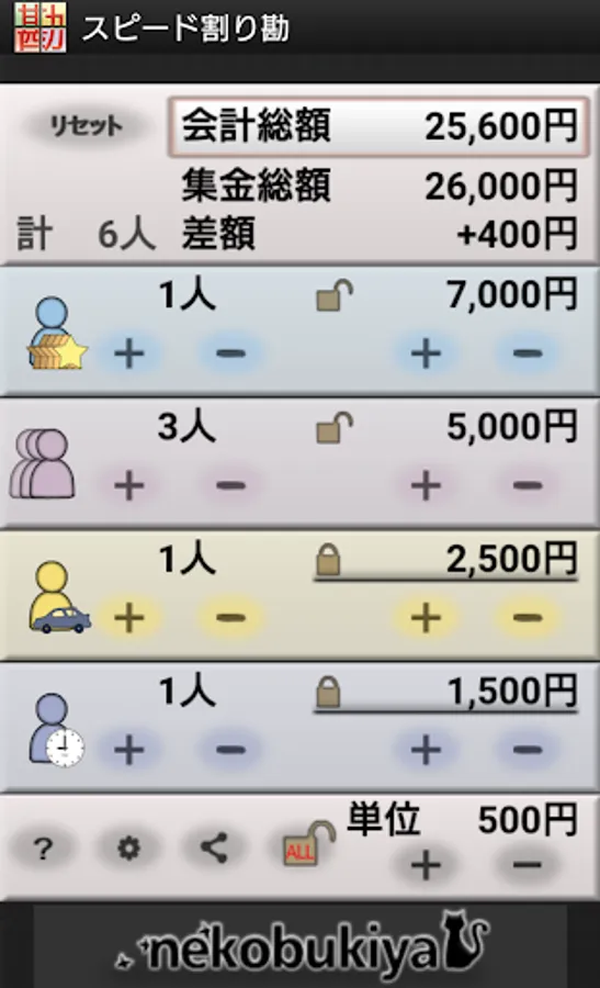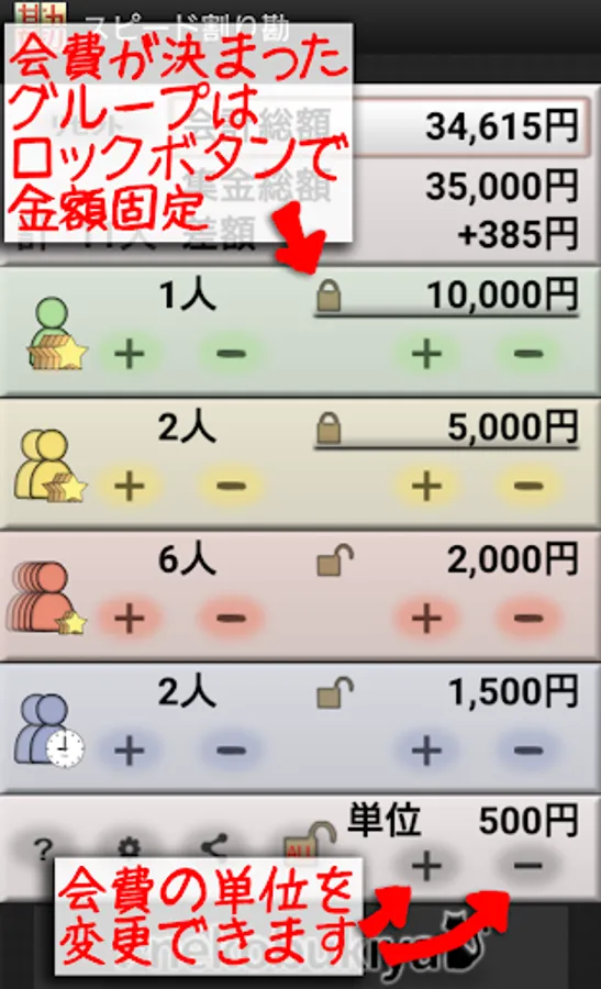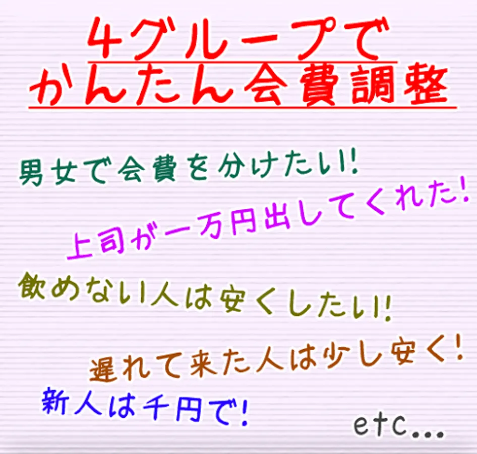 You can calculate up to four groups with different dues, such as “male”, “female”, “superior”, “subordinates”, “people who don't drink” and “people who have been late”.