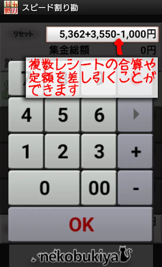 Since it is possible to add or subtract in the input of the accounting amount, it is possible to combine multiple receipts, subtract the surplus of the first meeting from the accounting of the second meeting, or subtract the discount, etc. You can save the trouble of calculating with.