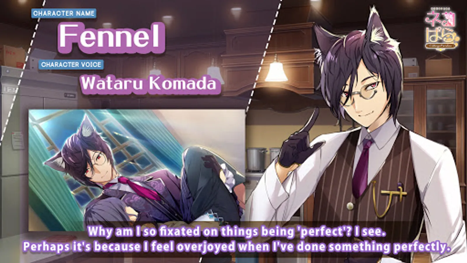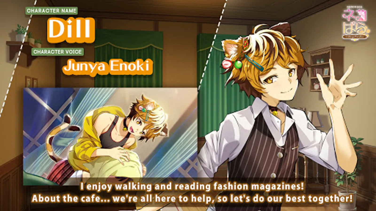 Dill is a very approachable catboy who can make friends with practically anyone. He is a big fan of fashion, which explains why his biggest worry is buying too many clothes. Sometimes he picks clothes for you or helps you with makeup.