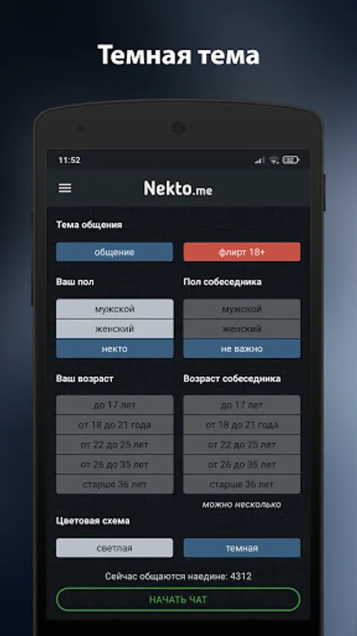Anonymous chat NektoMe allows to meet new people and discuss a variety of topics and concerns that you, while remaining unknown to the speaker. Complete anonymity guarantees the freedom of your statements.
