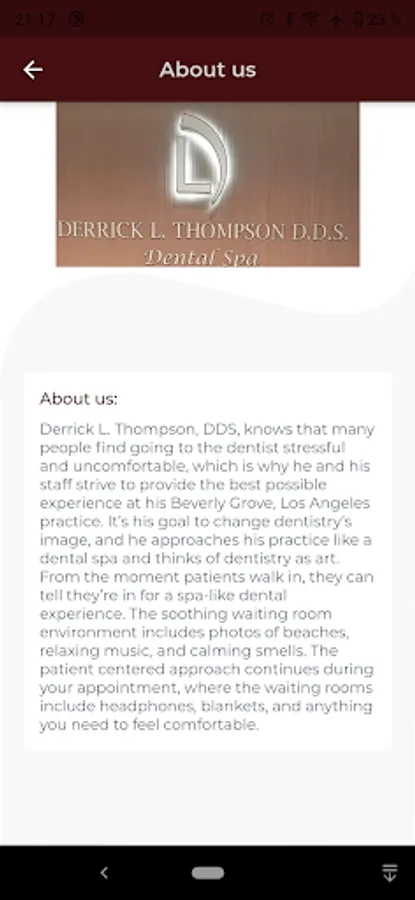 This app was Made for Derrick L. Thompson, DDS, the funcions of the app is Managment of Appointments Services and Information about our doctor in the Dental Office , the apps was made by Nelat.