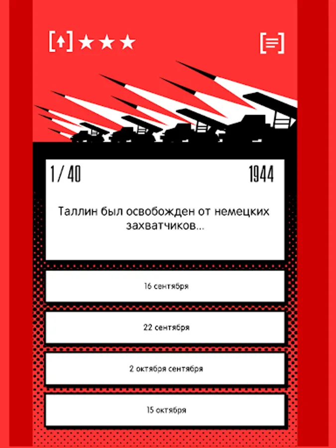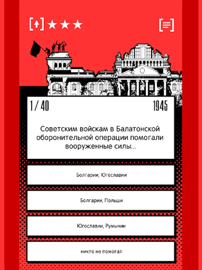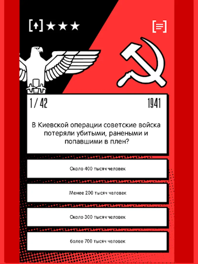 "May 9 - the price of victory" - is a unique military quiz about the "Great Patriotic War". The quiz covers the period from 1941 to 1945, and tests your knowledge in as much detail as possible. The Second World War claimed many innocent lives and we must remember it and honor the memory of our ancestors. Understand how hard it was for our ancestors, Victory Day.