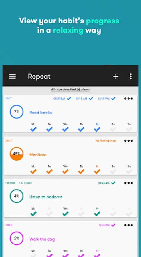 Repeat lets you focus on the routines you will have to do today. Combining both Goal tracker and habit tracker. Repeat will show your pending habit on a given day and will only just focus on that given day. With that approach you can focus more on the task at hand.