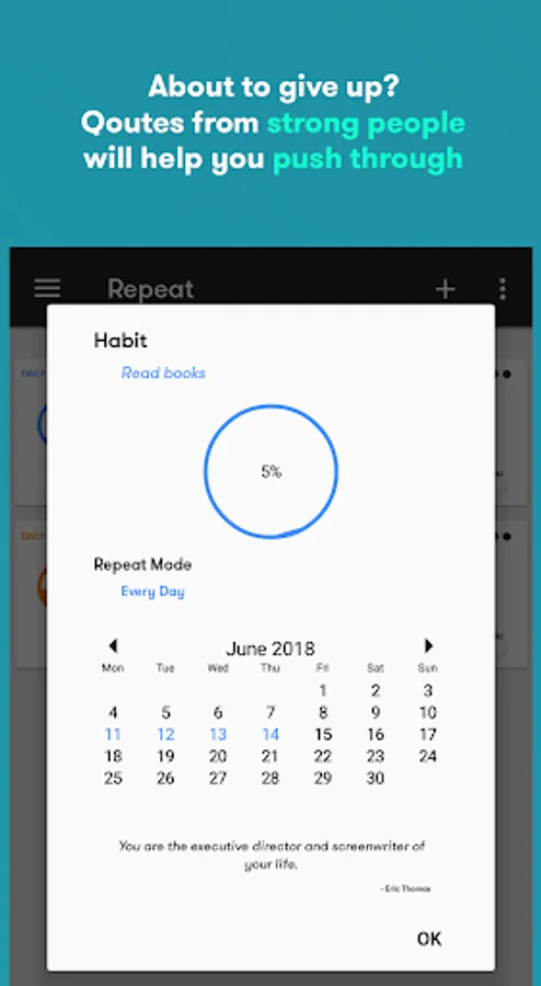 Repeat will show you motto from famous and successfull people(Jim Rohn, Les Brown, Tony robins) to help you push through the tough times to get you to where you want to be.