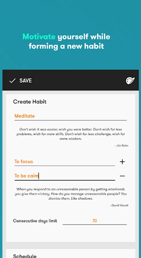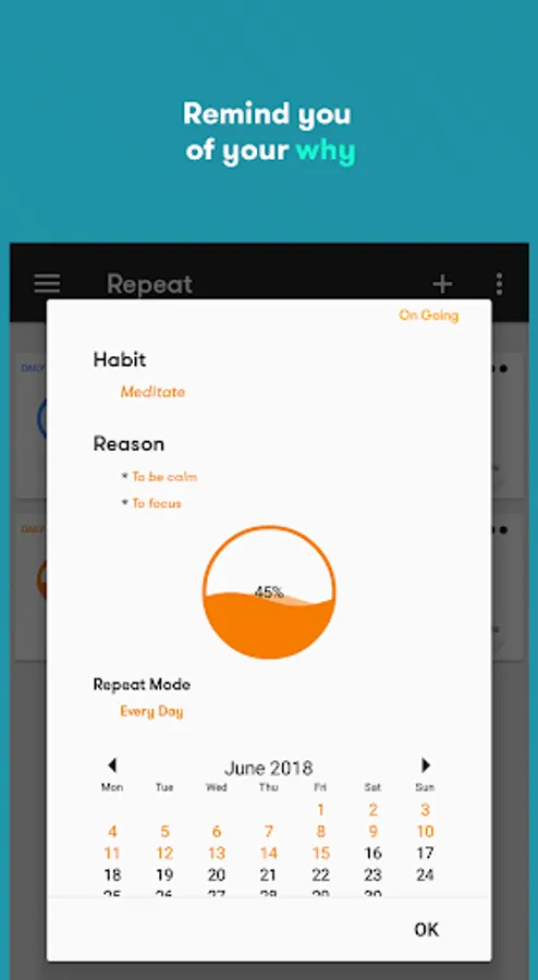 It takes 70 days to form a habit, Repeat will remind you and will notify you if you have a pending habit on a given time.