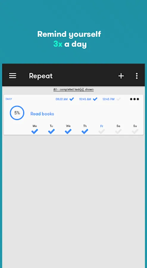 Repeat is a simple app that focuses on the core functionality of a habit and goal tracker app. It's like writing your goals on a paper.