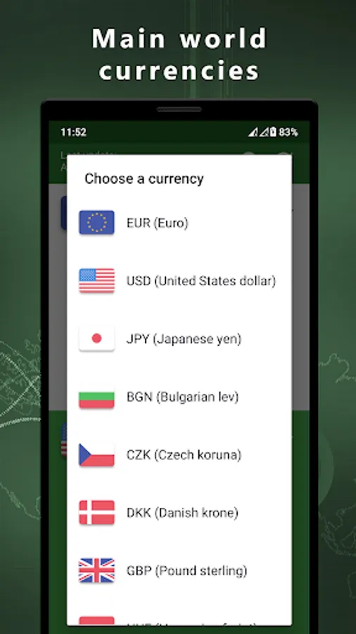 Euro, US dollar, Japanese yen, Bulgarian lev, Czech koruna, Danish krone, Pound sterling, Hungarian forint, Polish zloty, Romanian leu, Swedish krona, Swiss franc, Icelandic krona, Norwegian krone, Croatian kuna, Russian rouble, Turkish lira, Australian dollar, Brazilian real, Canadian dollar, Chinese yuan renminbi, Hong Kong dollar, Indonesian rupiah, Israeli shekel, Indian rupee, South Korean won, Mexican peso, Malaysian ringgit, New Zeland dollar, Philippine peso, Singapore dollar, Thai bath, South African rand.