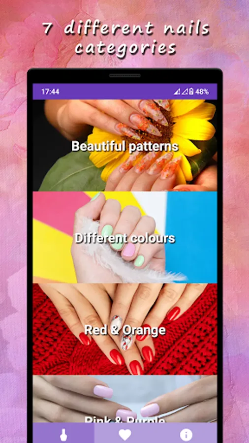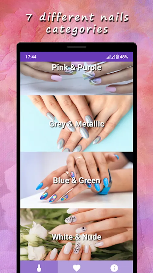 ✔️ 7 different categories that will inspire you to do your manicure: Beautiful patterns / Different colours / Pink & Purple / Red & Orange / Blue & Green / Gray & Metallic / White & Nude