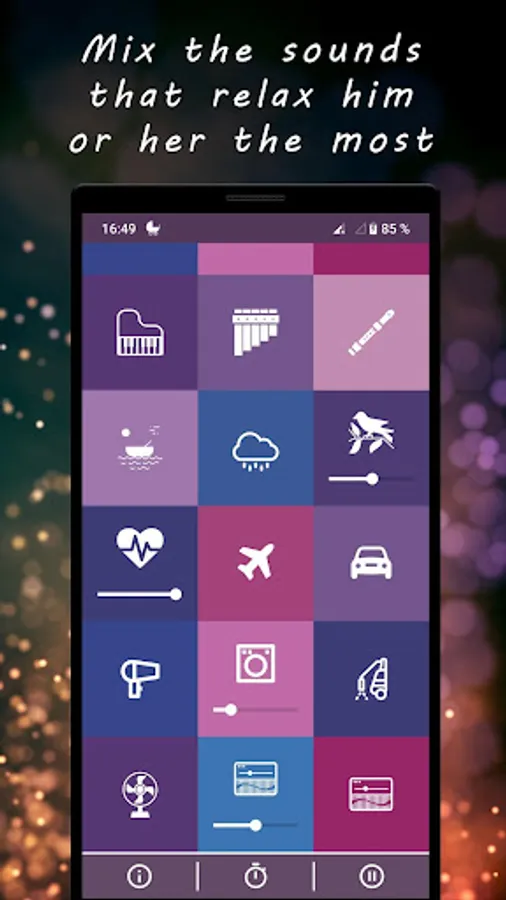 8 lullabies / xylophone / piano / pan flute / flute / river / rain / birds / heartbeat / plane / car / hair dryer / washing machine / vacuum cleaner / fan / brown noise / pink noise