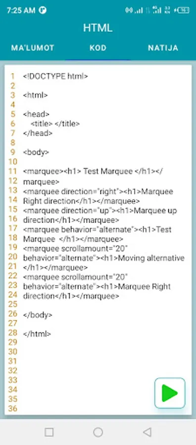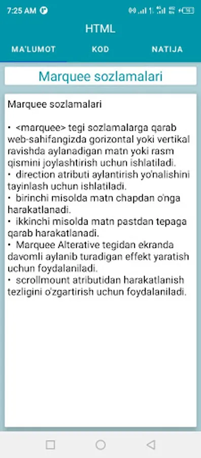 web dasturlash sohasini o'rganuvchilar uchun, HTML, CSS, JavaScript bo'yicha nazariy ma'lumotlar to'plami hamda namunaviy kodlar jamlanmasi. Foydalanuvchilar o'rgangan bilimlarini amaliyotda sinab ko'rishlari ham mumkin!