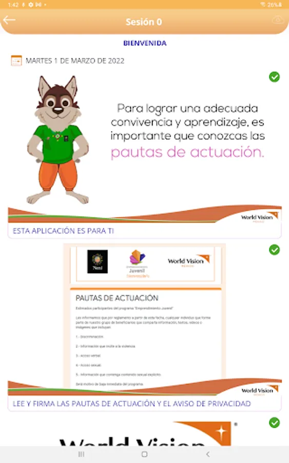 The contents can be downloaded so that the beneficiary can consult them, work on them and deliver them without the need for an internet connection. In this case, the progress will be updated for the tutor to consult when the beneficiary connects your device to the internet.