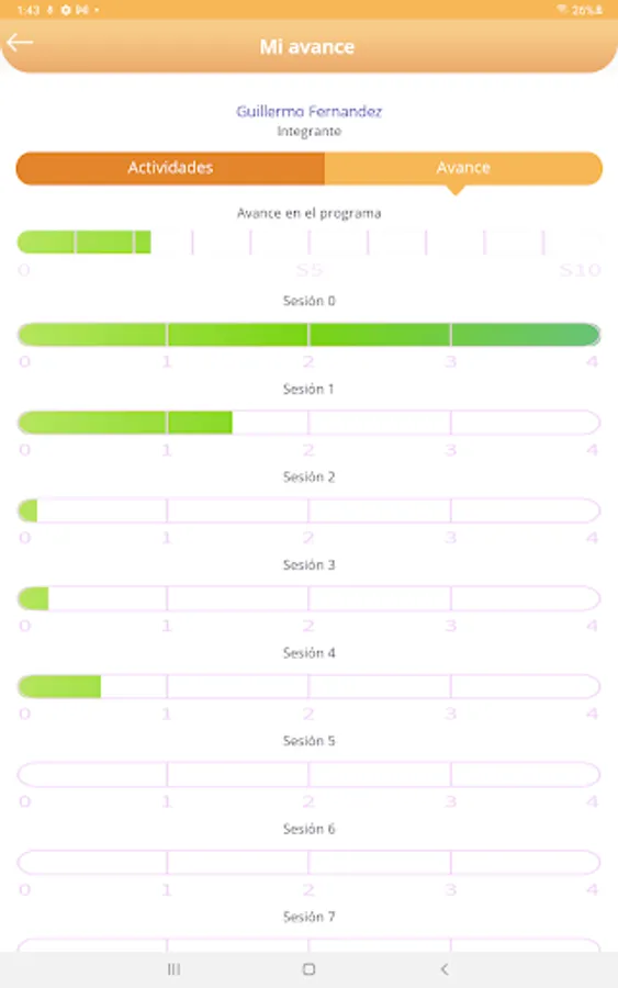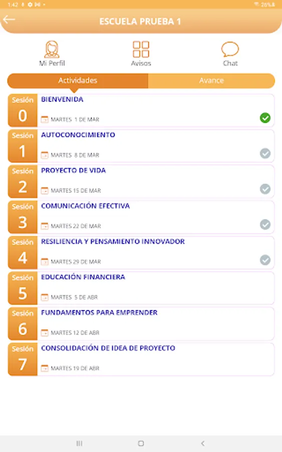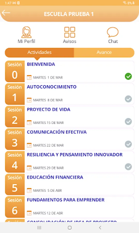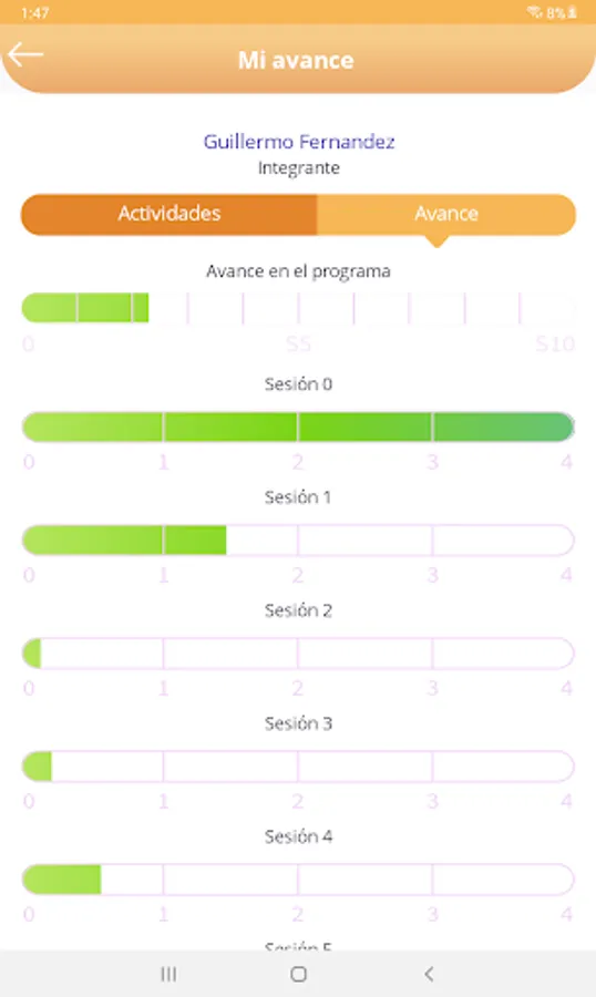 Each beneficiary has a profile that they can customize, in which they consult, develop and deliver the activities of the training process. The application has elements that allow them to consult the personalized progress that has been achieved in the weekly and total activities.