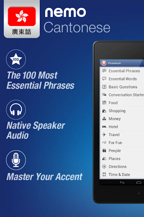 Nemo is designed to start you speaking the most useful words in Cantonese immediately and confidently. With millions of downloads from around the world, Nemo is now available for Android phones and tablets.