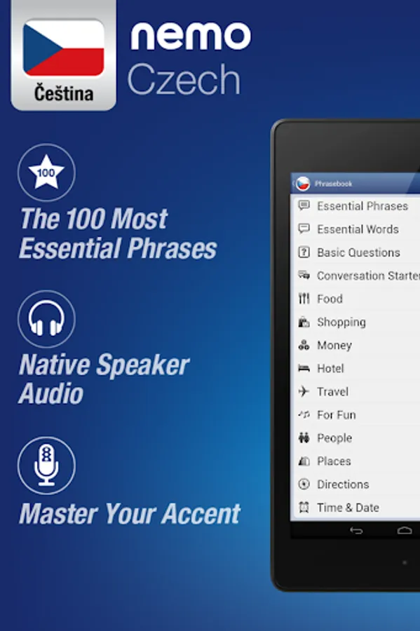 Nemo is designed to start you speaking the most useful words in Czech immediately and confidently. With millions of downloads from around the world, Nemo is now available for Android phones and tablets.