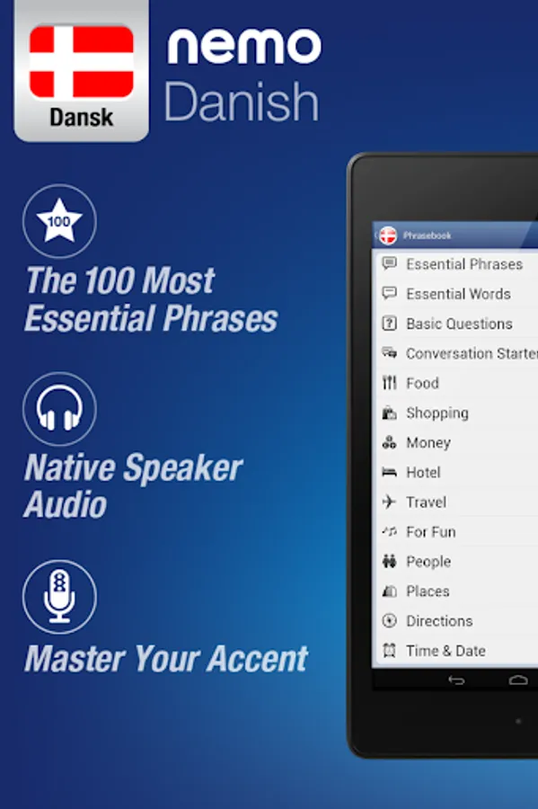Nemo is designed to start you speaking the most useful words in Danish immediately and confidently. With millions of downloads from around the world, Nemo is now available for Android phones and tablets.