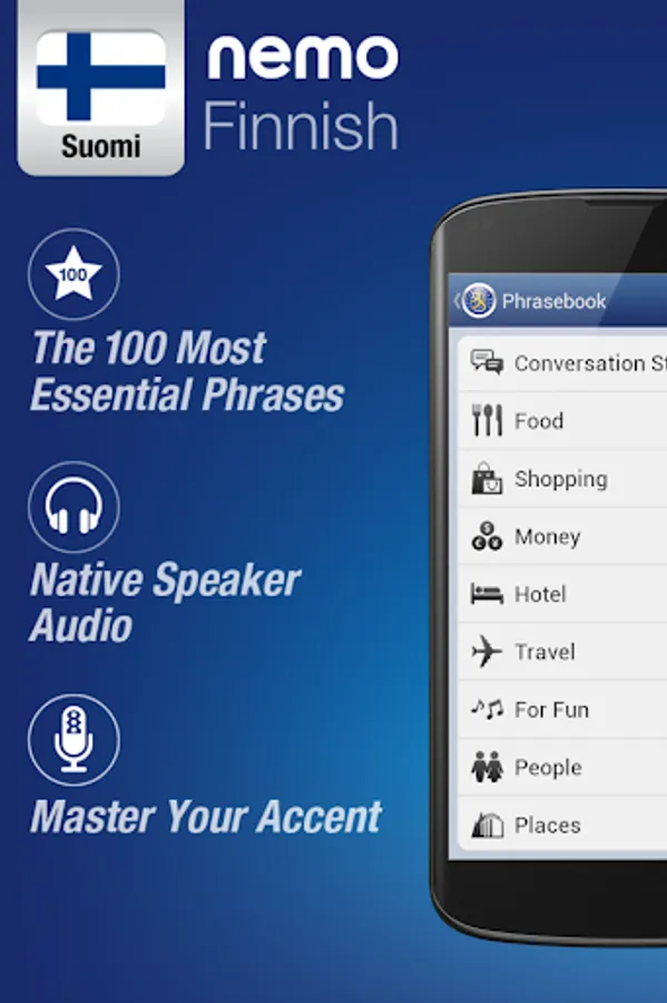 Nemo is designed to start you speaking the most useful words in Finnish immediately and confidently. With millions of downloads from around the world, Nemo is now available for Android phones and tablets.