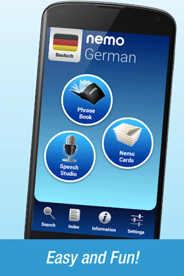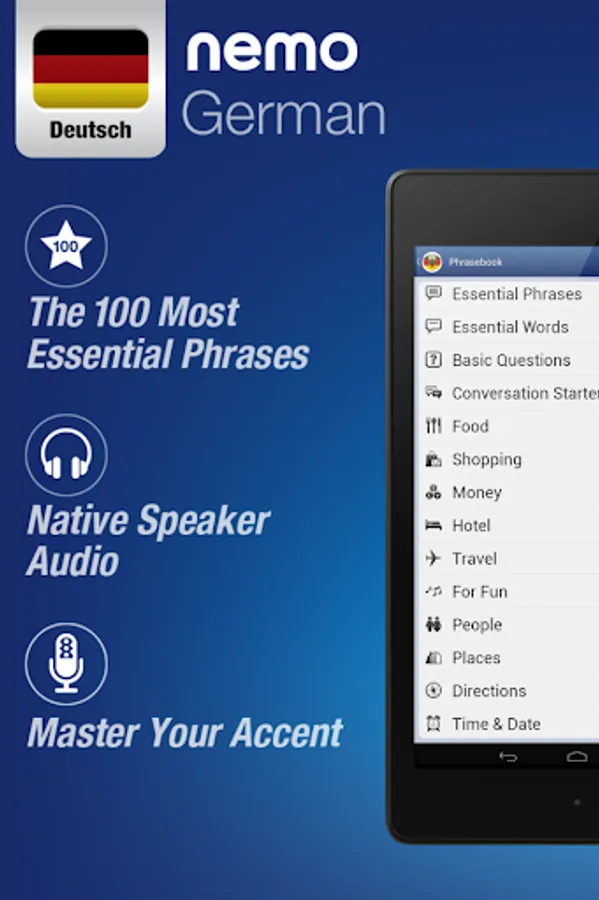 Nemo is designed to start you speaking the most useful words in German immediately and confidently. With millions of downloads from around the world, Nemo is now available for Android phones and tablets.
